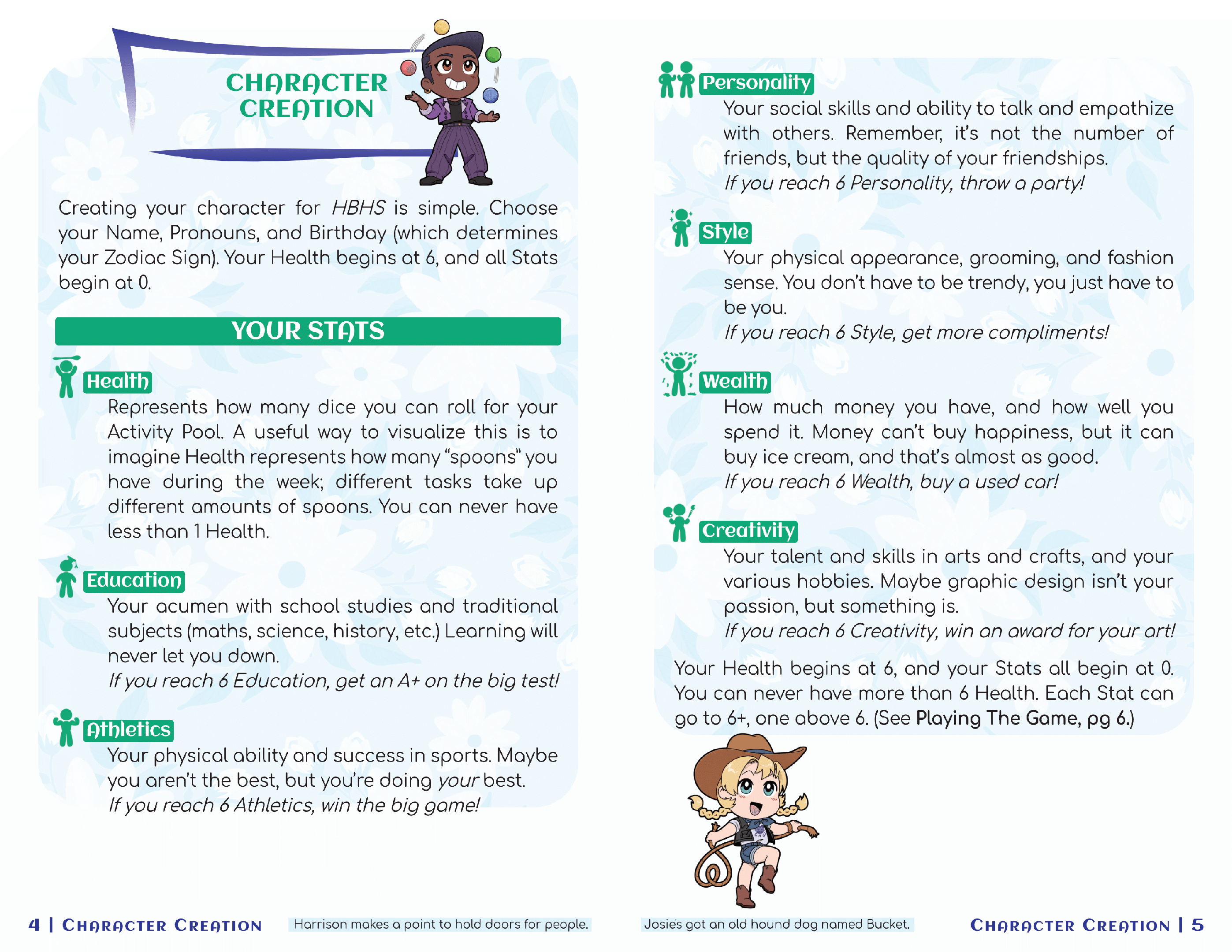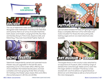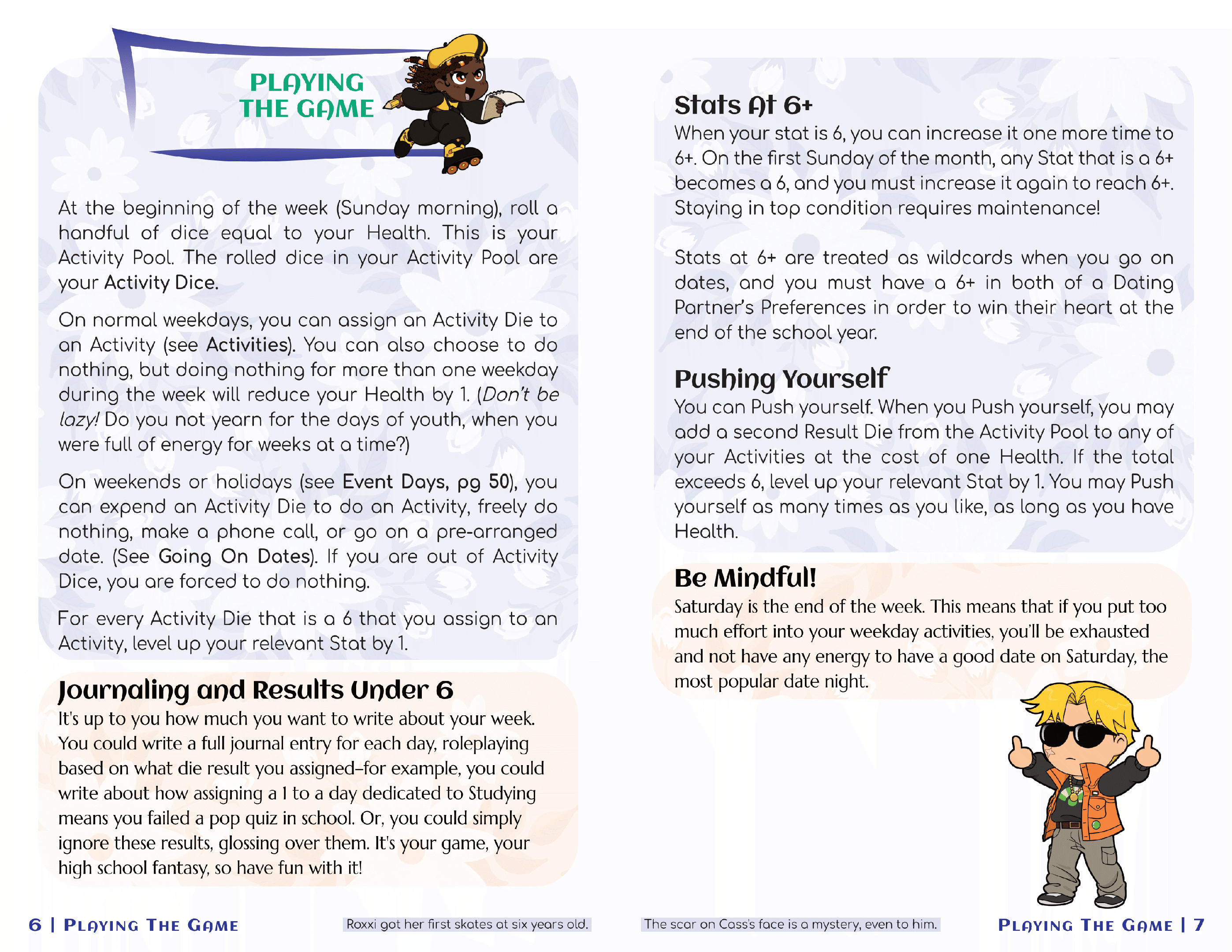 At the beginning of a week, you'll roll a pool of d6s equal to your Health Stat. This is your Activity Pool. On normal weekdays, you can assign the dice in your Activity Pool to an Activity, such as studying, working out, going to work, or engaging in a hobby. On weekends or some holidays, you can do an Activity, make a phone call, or go on a date. When the dice in your pool are 6s, you can level up your stats, making you more attractive to potential Dating Partners.